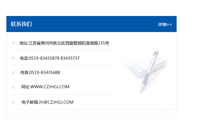 傳真:0519-83435688    郵編:213135    網(wǎng)址:WWW.czjhgj_com.zhujinwang.com    電子郵箱:JH@czjhgj_com.zhujinwang.com